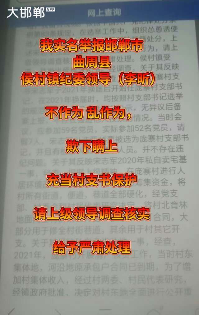 检举材料 检举人:宋良国系河北省邯郸市曲周县候村镇庞寨村人 被检举人:李昕河北省邯郸市曲周县候村镇党委副书记 事实与理由我村支部书记宋志军在两委换届时,提前拿出写好被选人名单的选票.委托他人交给参加选举人员,强迫选举人员投入票箱,我留有视频。2020年将村北7亩集体土地划为14片宅基地,我有收据。这些证据我都交给了李昕,可李昕在向上级回复时,隐瞒事实.为其百般辩护。李昕的这种行为完全是欺下瞒上,做两面人。中国共产党纪律处分条例第58条规定,对党不忠诚.不老实,表里不一阳奉阴违搞两面派,做两面人。第63条第4款规定,向组织提供虚假情况.掩盖事实情节严重的给予开除党籍处分,李昕的严重错误行为请上级领导调查,给予严肃处理。