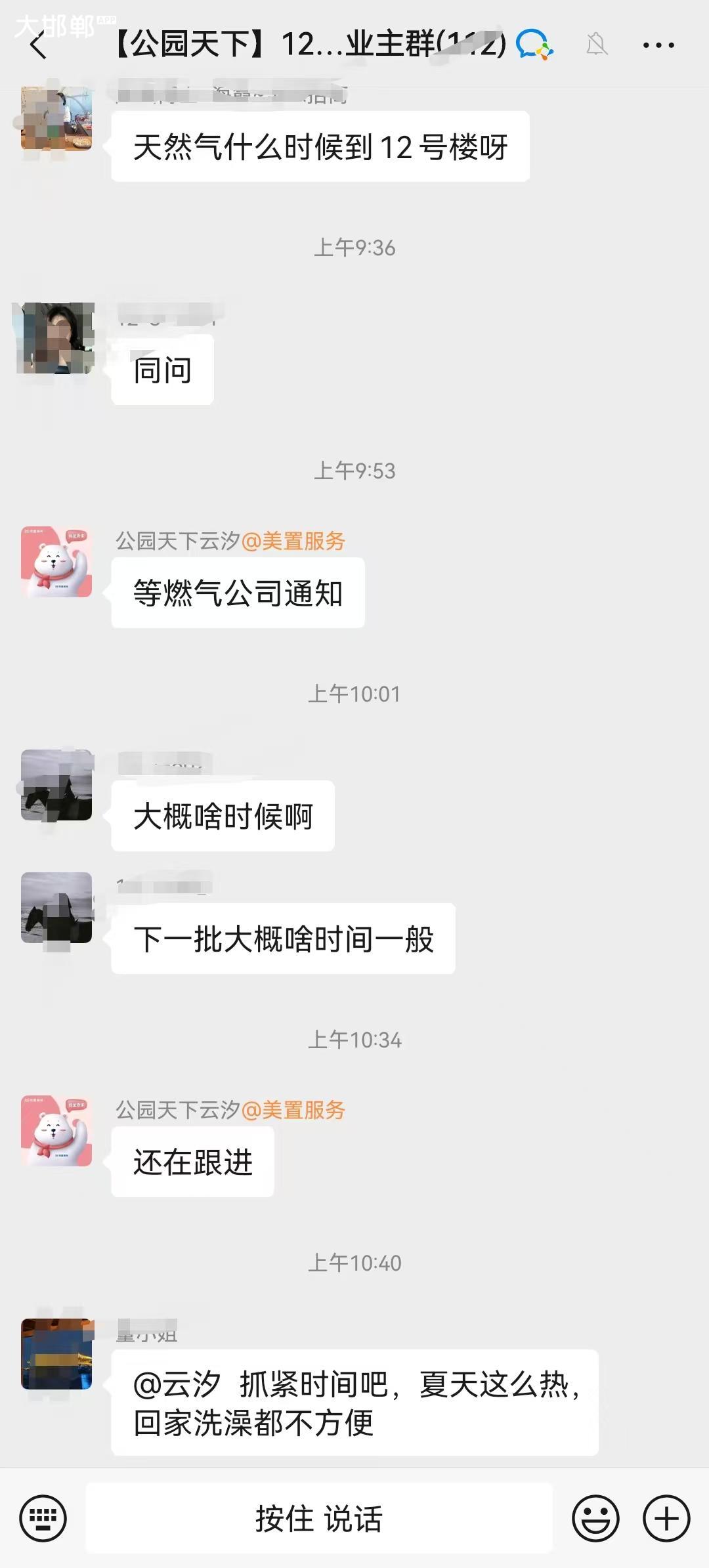 邯郸华润燃气公司,请你赶紧给我们通气吧,验收时你们说收费买管就买管,说是只能用你们的,还收费那么高(大几百块钱),但也为了早点点火通气我们也忍了,全都配合你们,现在天气这么热,洗个澡都麻烦,别说其他做饭什么的了,天天点外卖,难道是故意刁难我们业主吗?还请邯郸市住建局监督监督,真正的解决一下我们民生的问题