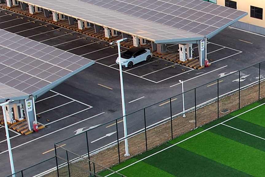广场东侧区域打造了约5000平方米城市广场,既为运动爱好者提供专业健身场地,也为亲子互动、赛事观赏等活动提供优质空间。广场西侧则是停车场,同时配备了光储充放一体化充电站。