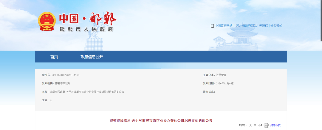 邯郸市民政局 关于对邯郸市茶馆业协会等社会组织进行处罚的公告