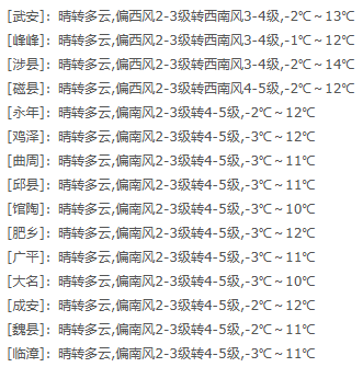 今天晴朗持续,早上各地最低气温与昨天基本持平,其中曲周最低为-6℃,邯郸市区-3.2℃。白天最高气温回升较快,基本都在10℃左右,邯郸市区9.9℃。