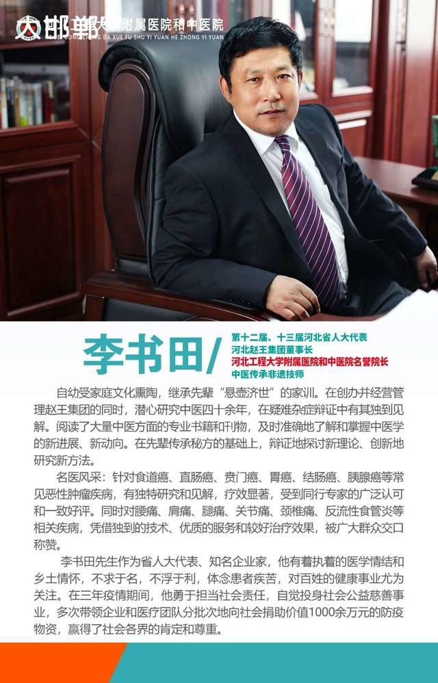 邯郸和中医院以中医治疗为特色,成立了以赵王集团董事长、和中医院名誉院长、中医传承非遗技师李书田先生为核心的一支高素质中医研发、临床专业团队,秉承患者至上,服务至上的理念,以“减轻患痛,延长生命”为宗旨。在传承中医基础上,辩证地探讨新理论、创新地研究新方法。针对食道癌、直肠癌、贲门癌、胃癌、结肠癌、胰腺癌等常见恶性肿瘤疾病,有独特研究和见解,受到同行专家的广泛认可和一致好评。同时对腰痛、肩痛、腿痛、关节痛、颈椎痛、反流性食管炎、脱发等相关疾病,也有独特疗效。医院凭借精湛的医疗技术、优质的服务,被广大患者交口称赞。