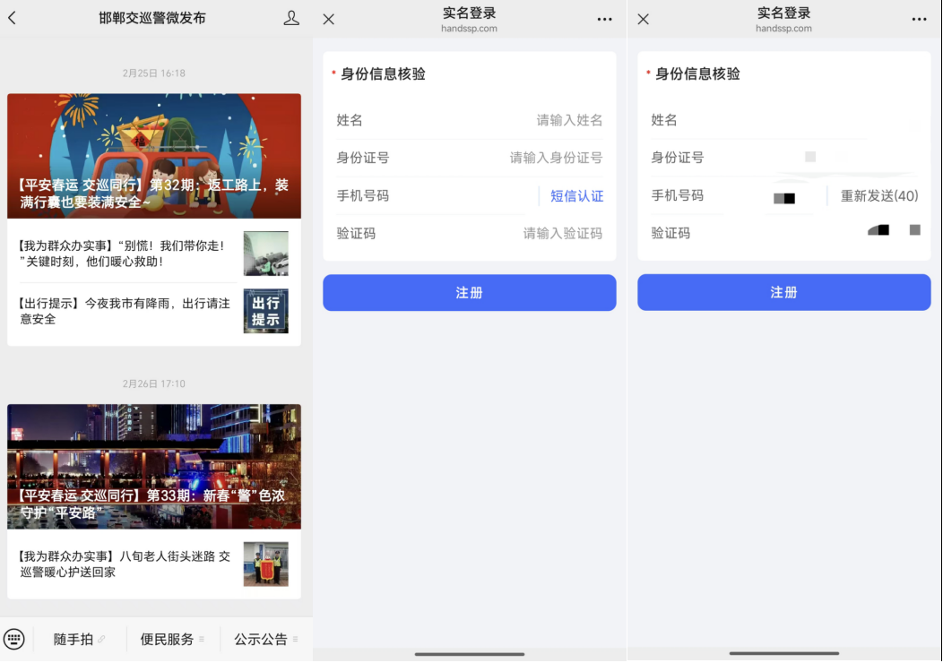 拍摄交通违法行为后,进入“邯郸交巡警微发布”微信公众号,实名注册后即可快速举报: