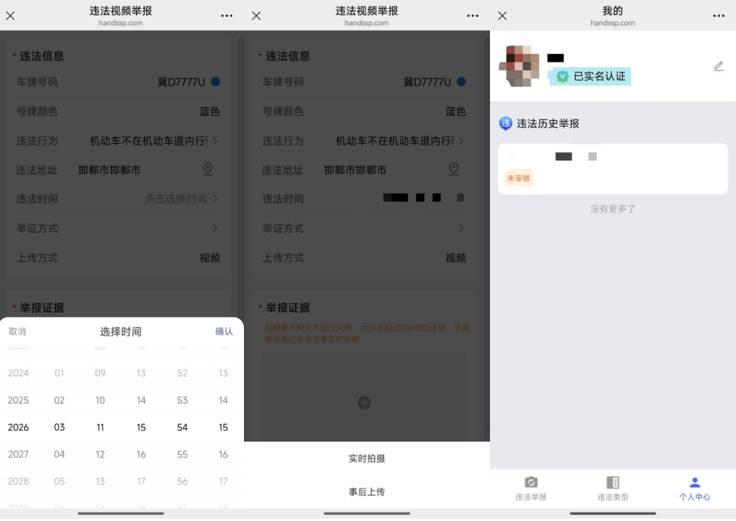 (二) 事后举报。违法发生后24小时内上传视频,举报人手动填写违法时间、地点即可。