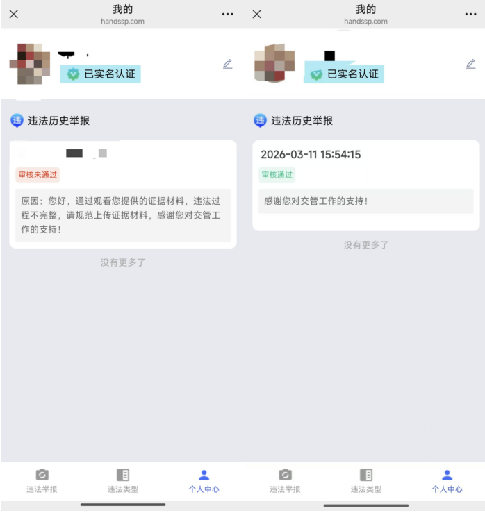交管部门将在5个工作日内对上传的违法视频进行专业审核,举报人可进入“邯郸交巡警微发布”公众号,通过“随手拍-个人中心”查看审核结果。