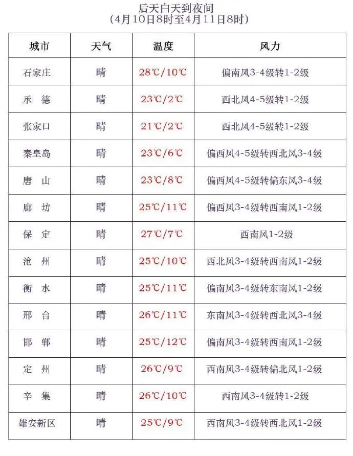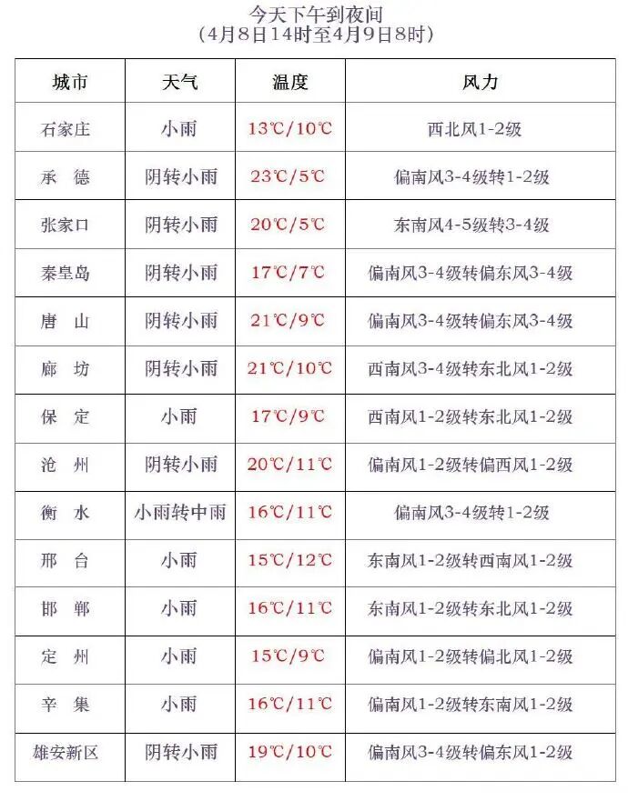 今天下午到夜间,全省多云转阴,石家庄、沧州及以南地区有小到中雨,其他地区有小雨或零星小雨。最高气温,全省大部分地区14~22℃。最低气温,张家口北部、承德北部-2~4℃,其他地区5~13℃。