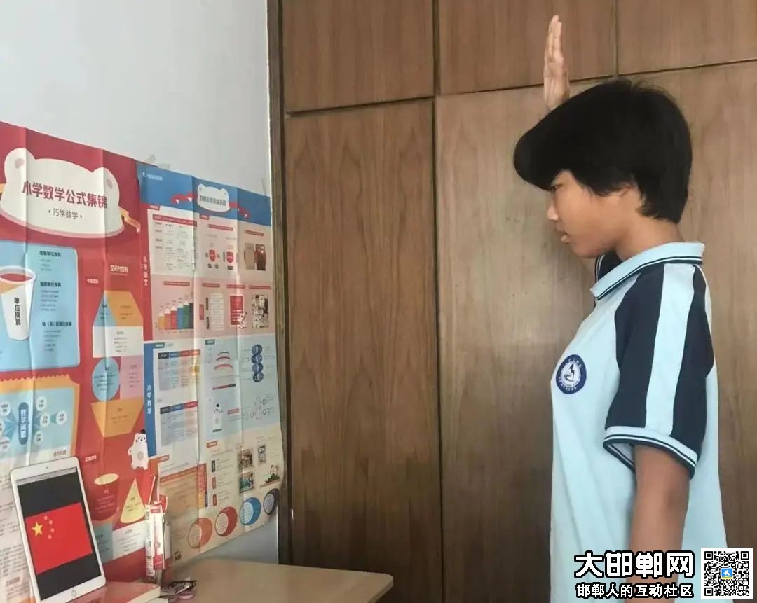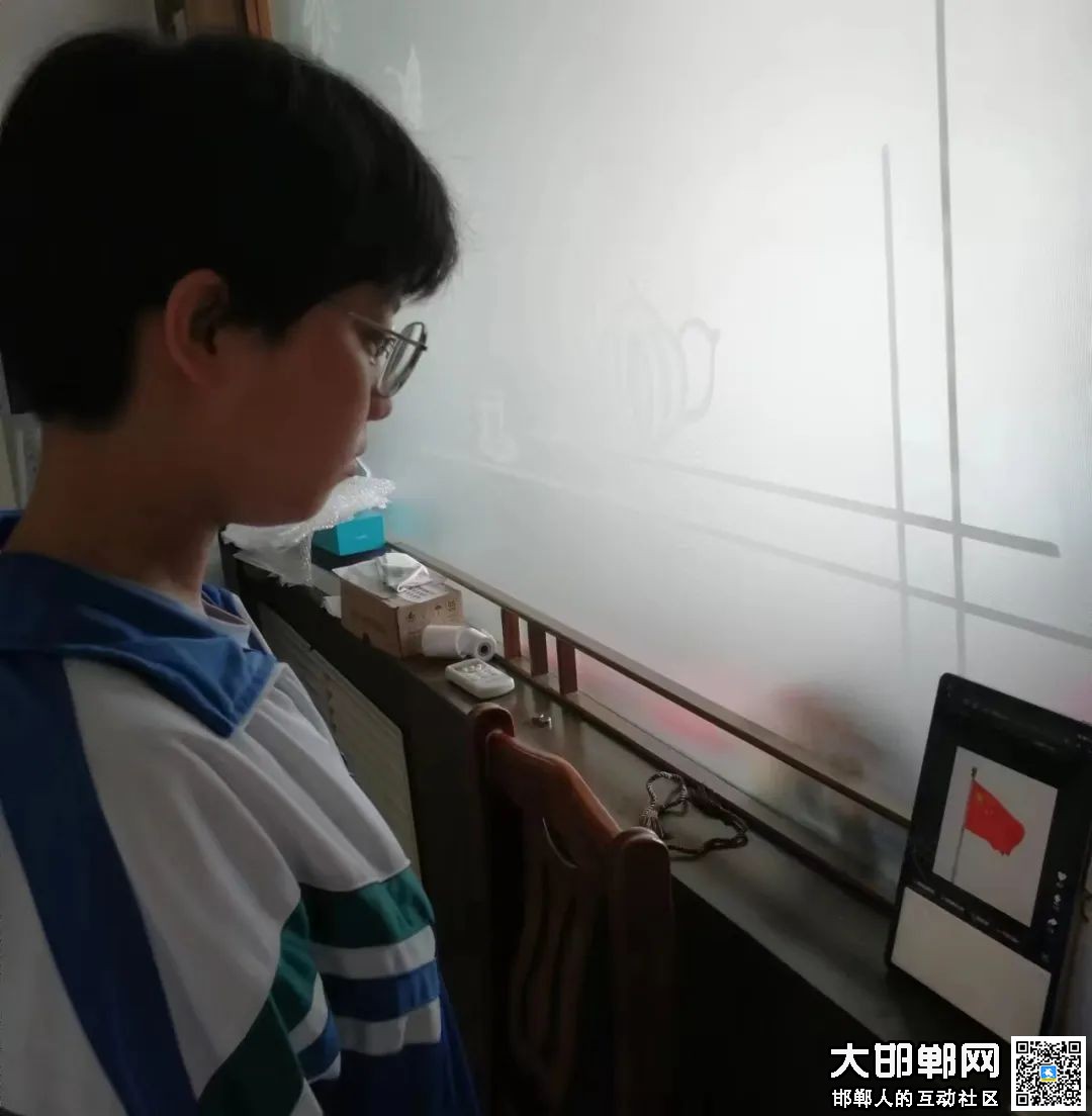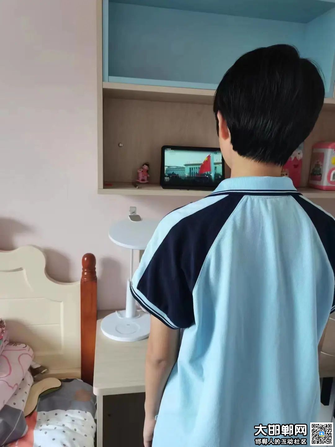 学校精心准备了天安门升旗仪式视频,全体学生穿着整洁的校服,面对升旗画面,行注目礼,跟唱《中华人民共和国义勇军进行曲》,居家接受一场深刻的爱国主义教育。