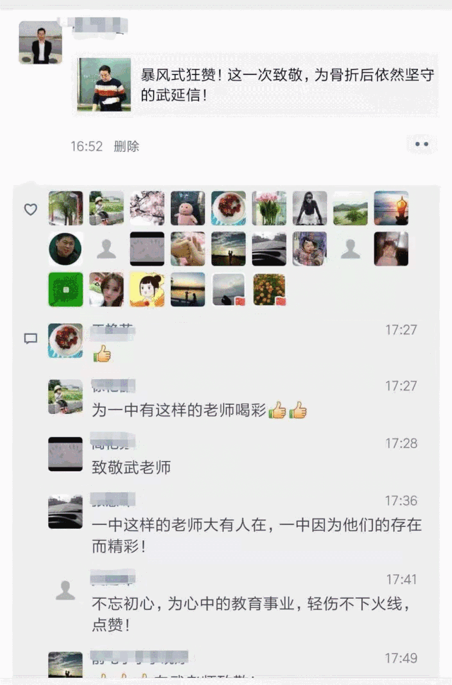 “心系学生,坚守岗位,为你点赞!”“为一中有这样的老师喝彩!”“致敬武老师!”左手骨折打了3颗钢钉一只手备课、板书、批改作业自始至终没请一天假他已经火爆朋友圈他就是肥乡一中教师武延信肥萱萱看到他时他正在教师里辅导学生晚自习说起受伤的经过武延信轻轻一笑说:“也没啥,10月27日上午下班回家的路上,不小心被一辆电动三轮车撞到,当时左手小拇指出了点血,我感觉问题不严重,对方又是一位老人,所以就让人家走了~”武延信没把受伤的事放在心上只是没想到接下来的几天里他的手肿胀得越发严重最终经医生诊断为左手横断骨折并建议尽快手术并静养恢复“我当时就想,自己现在带的可是高三,关键时刻,不能耽误了学生们的课啊~反正又不是什么大伤,跟其他同事调一下课就可以~”武延信“不是什么大伤”的左手被医生打上了三颗钢钉而这个手术也只是他在上课和批改作业的间隙完成的武延信憨憨地笑着说:“虽然左手不能动,我的右手还正常啊,没事儿,啥也影响不了~”对于武延信而言学生就是他的一切他说,自己是一名高三教师更是一名共产党员坚守讲台是一种责任和幸福“只要手握粉笔、面对学生们求知若渴的眼睛,手就不疼了~”在激情洋溢的每一节课上他诠释着一位教育工作者的敬业和无私而且,武延信还像平日一样每天早上六点准时在学校操场看同学们跑操伤筋动骨一百天当所有人都裹着羽绒服还在瑟瑟发抖的时候他则敞着衣服左手外露一边关注着同学们的情况一边又在心里默默盘算着这一天的课程要如何上得更加精彩武延信的事迹在朋友圈传开当问及这些事时他只是微笑着说:“这有什么呀,我只是做了我应该做的~”市教科所命题工作先进个人市、区高考先进个人市优质课一等奖市先进德育工作者市教育系统劳动模范一个个先进和荣誉是武延信辛苦付出的有力见证倾心教育13年他更多的努力还被此刻同学们的真心表白见证着文到此处大家是不是跟肥萱萱一样被满满的感动溢满心底眼眶有热热的液体在涌动正如大家在留言中写道这是肥乡一中老师的缩影一中因这样的老师而精彩其实这也是肥乡建设者的一个缩影太多太多的人儿用他们的执着和无私书写着坚守初心使命、建设美好家乡的生动实践503平方公里的大地因这样的人儿而温暖肥乡,明天会更好编辑:宋亚娜(第一中学)、卢晓丽(教体局)(微观肥乡)